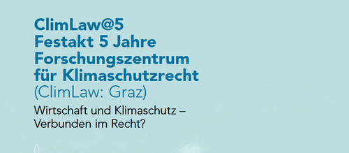 Das Forschungszentrum für Klimaschutzrecht (ClimLaw: Graz) der Universität Graz feiert sein fünfjähriges Bestehen. Zu diesem Anlass wird herzlich zum Festakt „ClimLaw@5 – Festakt 5 Jahre Forschungszentrum für Klimaschutzrecht: Wirtschaft und Klimaschutz - Verbunden im Recht?“ eingeladen.