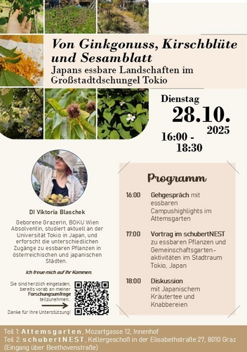 Es wird eingeladen zur Veranstaltung "Von Gingkonuss, Kirschblüte und Shiso - Japans essbare Landschaften und Gemeinschaftsgärtnern im Großstadtjungel Tokio, Japan." in den Attemsgarten bzw. ins schubertNEST.