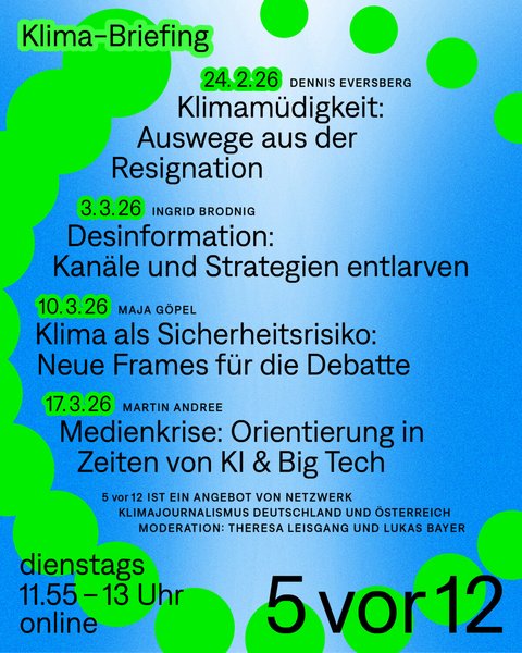 Am 24. Februar startet das Netzwerk Klimajournalismus Deutschland & Österreich wöchentlich ihre 5vor12 Klima-Briefings. In Staffel 5 wird nachgefragt, welche Ressourcen wir im Jahr 2026 brauchen, angesichts von KI, Kündigungen und Klima-Backlash.