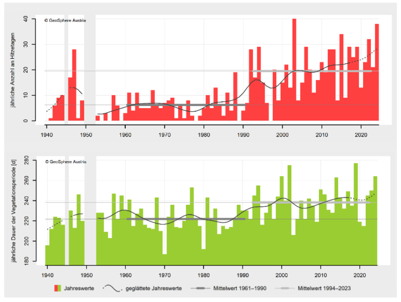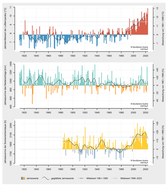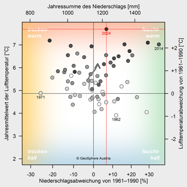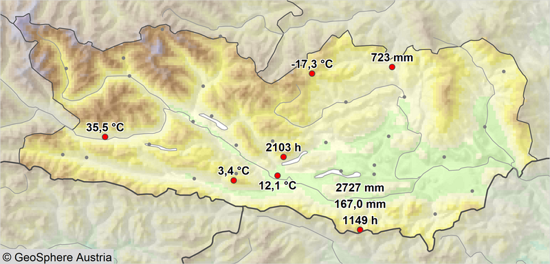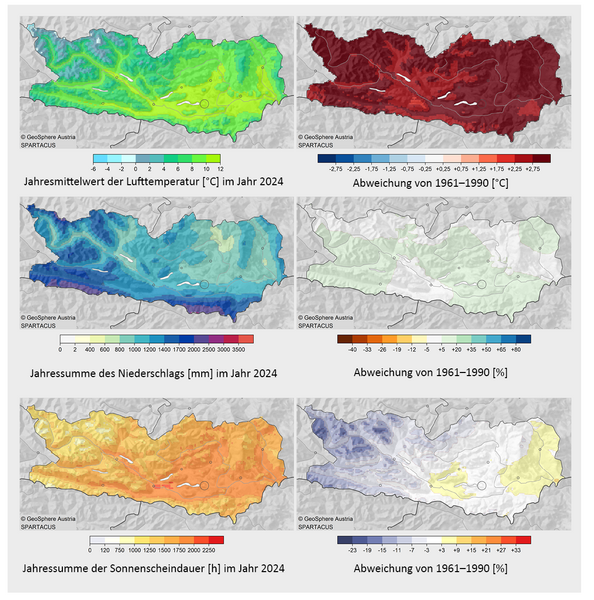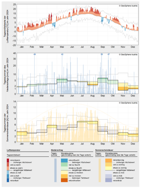 2024 war mit einer mittleren Temperatur von 7,7 °C (Abw. +2,8 °C) mit großem Abstand das wärmste Jahr in der Messgeschichte Kärntens. Die Monatsmitteltemperaturen der Monate Februar und August waren jeweils die wärmsten der Messgeschichte des Bundeslandes. Insgesamt erreichten 7 Monate Top 10 Platzierungen. Nach der extrem milden Phase von Anfang Februar bis Mitte April sorgte ein Kaltlufteinbruch in Kombination mit Schneefall und Sturm für Stromausfälle und erhebliche Behinderungen im Straßenverkehr. Die sommerliche Hitze sorgte in Kombination mit der Niederschlagsarmut im August für erhebliche Schäden in der Land- und Forstwirtschaft. Im September verursachte das Mittelmeertief „Anett“ durch Sturm und Starkregen große Schäden…