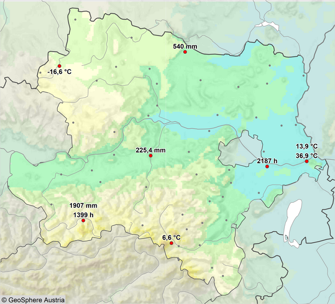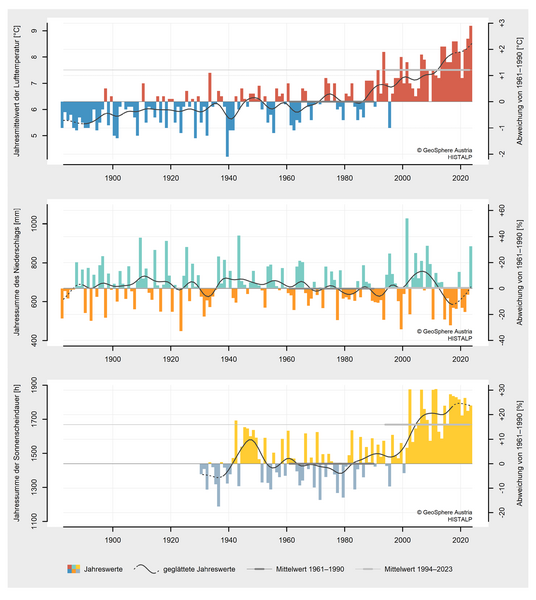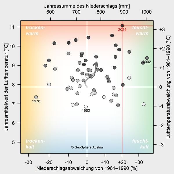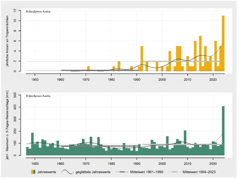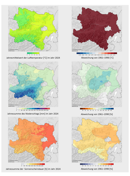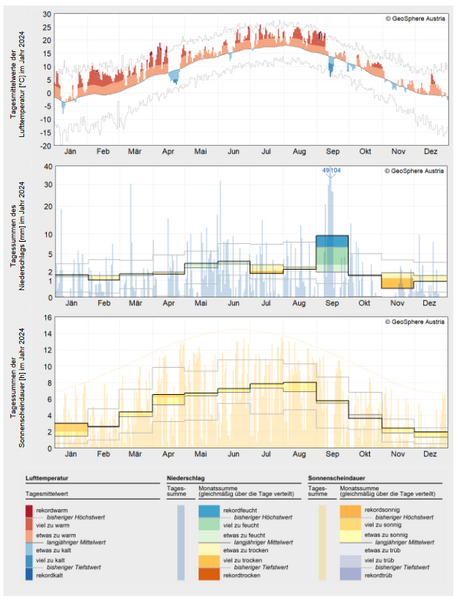 2024 war mit einer mittleren Temperatur von 11,1 °C (Abw. +3,2 °C) mit großem Abstand das wärmste Jahr in Niederösterreichs Messgeschichte und übertraf das bisher wärmste Jahr 2023 um 0,5 °C. Beginnend mit dem Winter 2023/2024 gab es in Niederösterreich drei rekordwarme Jahreszeiten in Folge und auch der Herbst erreichte einen Platz unter den Top 10. Nach der extrem milden Phase von Anfang Februar bis Mitte April und der damit verbundenen weit fortgeschrittenen Pflanzenentwicklung sorgte ein Kaltlufteinbruch in der zweiten Aprilhälfte für große Schäden im Obst- und Weinbau. Vor allem die östliche Hälfte des Bundeslandes litt unter der sommerlichen Hitze mit bis zu 57 Hitzetagen und langen Trockenphasen, die von gelegentlichem Starkregen unterbrochen wurden. Ein Mittelmeertief sorgte im September für enorme Regenmengen und vor allem im Westen und Süden des Bundeslandes für katastrophale Überschwemmungen…