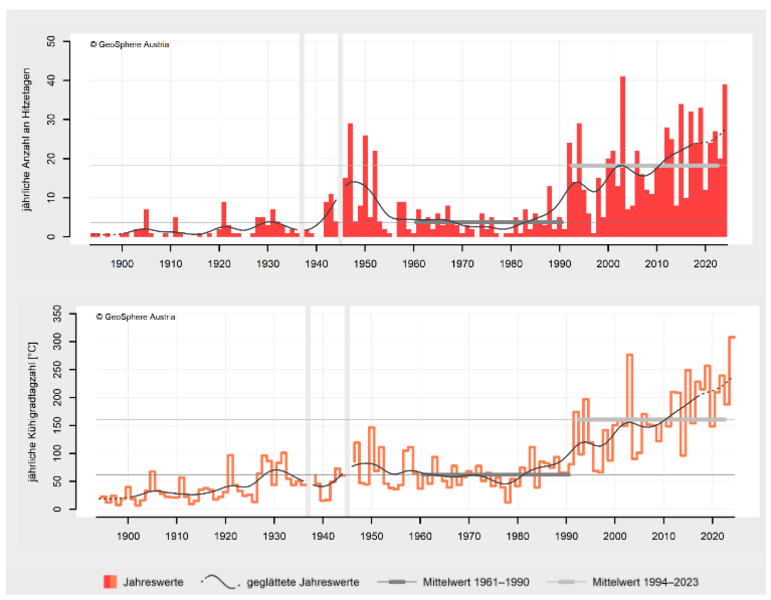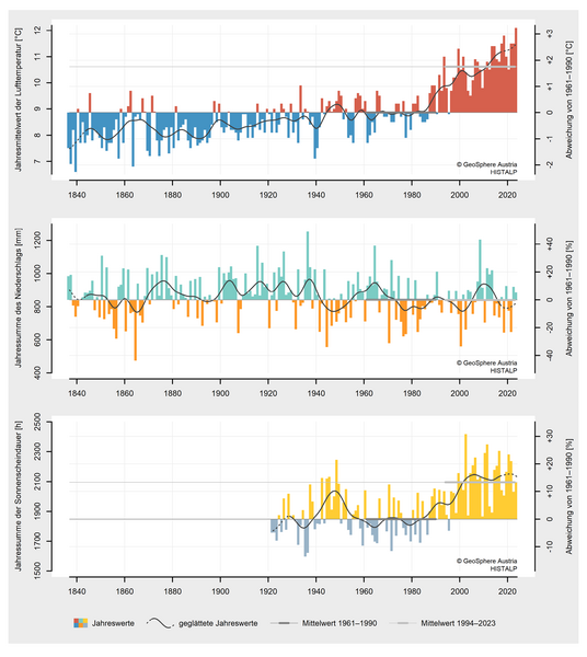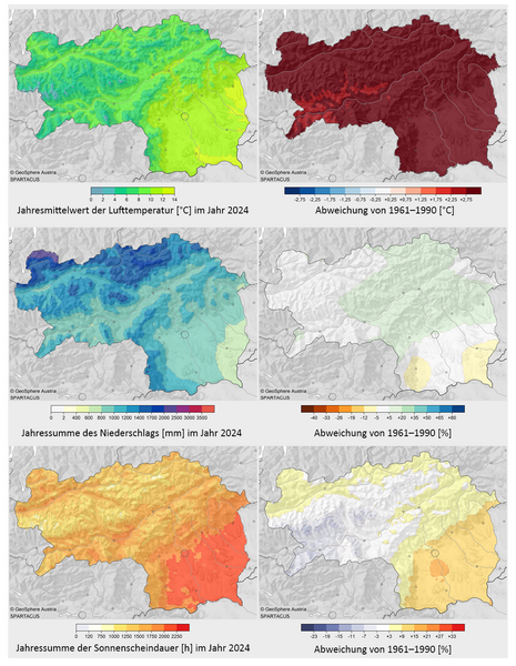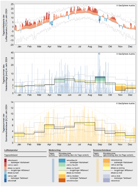 2024 war mit einer mittleren Temperatur von 8,9 °C (Abw. +3,0 °C) mit großem Abstand das wärmste Jahr in der Messgeschichte der Steiermark. Beginnend mit dem Winter 2023/2024 gab es in der Steiermark drei rekordwarme Jahreszeiten in Folge. Nach der extrem milden Phase von Anfang Februar bis Mitte April und der damit verbundenen weit fortgeschrittenen Pflanzenentwicklung sorgte ein Kaltlufteinbruch in der zweiten Aprilhälfte für große Schäden im Obst- und Weinbau. Die sommerliche Hitze sorgte kombiniert mit der relativen Niederschlagsarmut für erhebliche Schäden in der Land- und Forstwirtschaft Im September verursachte das Mittelmeertief „Anett“ durch Sturm und Starkregen große Schäden…